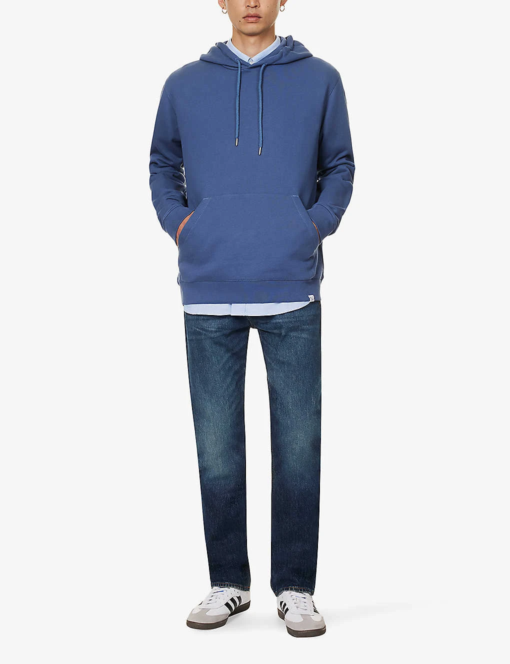 - Regular fit, mid-rise, straight leg, belt loops, five pockets, whiskering, brand patch at back, contrast stitching, partially lined