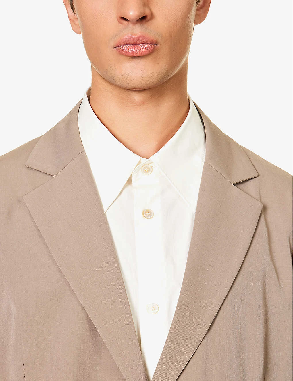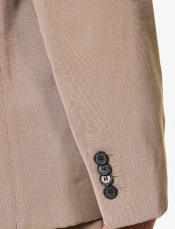 - Relaxed fit, notched lapels, long sleeves, buttoned cuffs, darts at front, two flap pockets at front, slip pocket at interior, partially lined