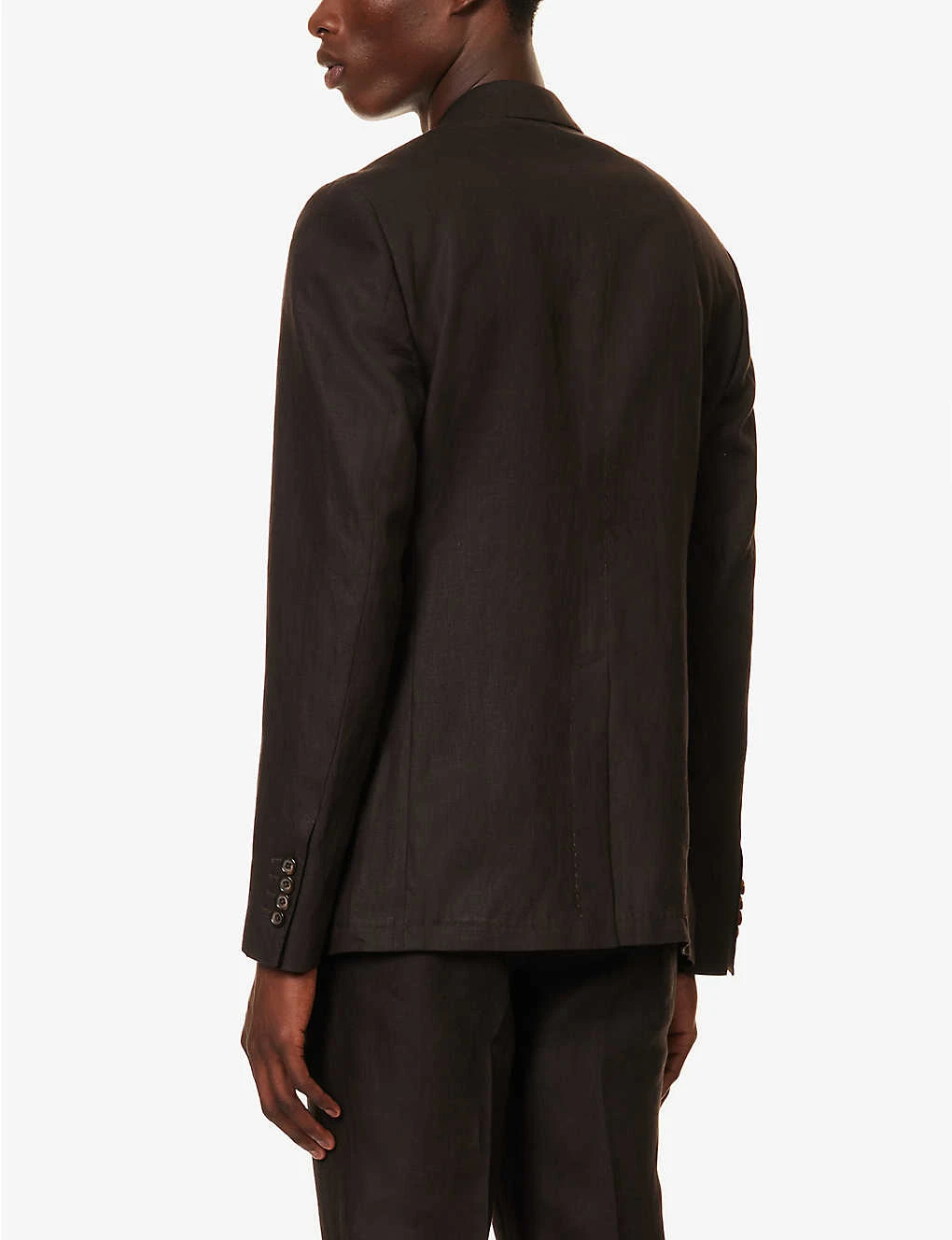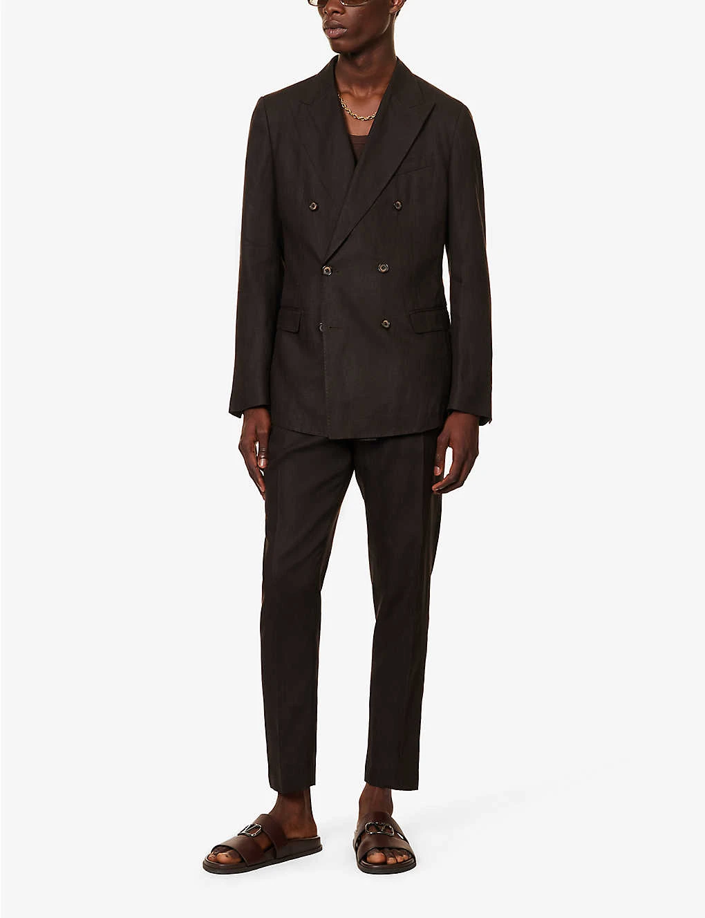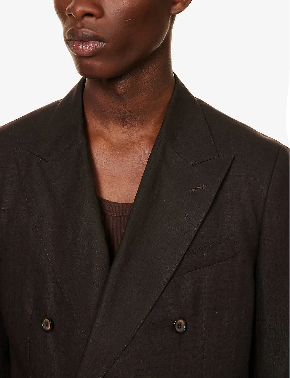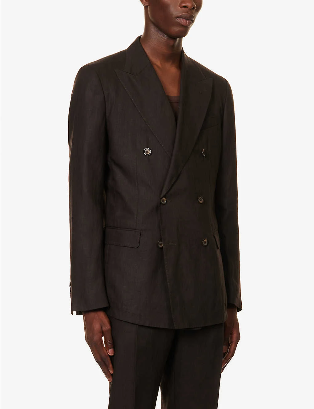 - Regular fit, double breasted, peak lapels, padded shoulders, long sleeves, buttoned cuffs, welt pocket at chest, darts at front, two flap pockets at front, vent at back, partially lined