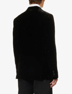 - Regular fit, peak lapels, structured shoulders, long sleeves, buttoned cuffs, welt pocket at chest, two flap pockets at front, twin vents at back, velour texture, sparkle weave, two slip pockets at interior, sequin trims, fully lined