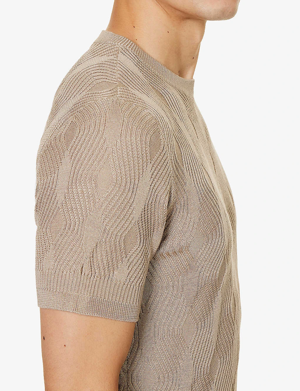 - Regular fit, crew neck, short sleeves, elasticated cuffs, all over embossed pattern, all over knitted, ribbed trims, elasticated hem