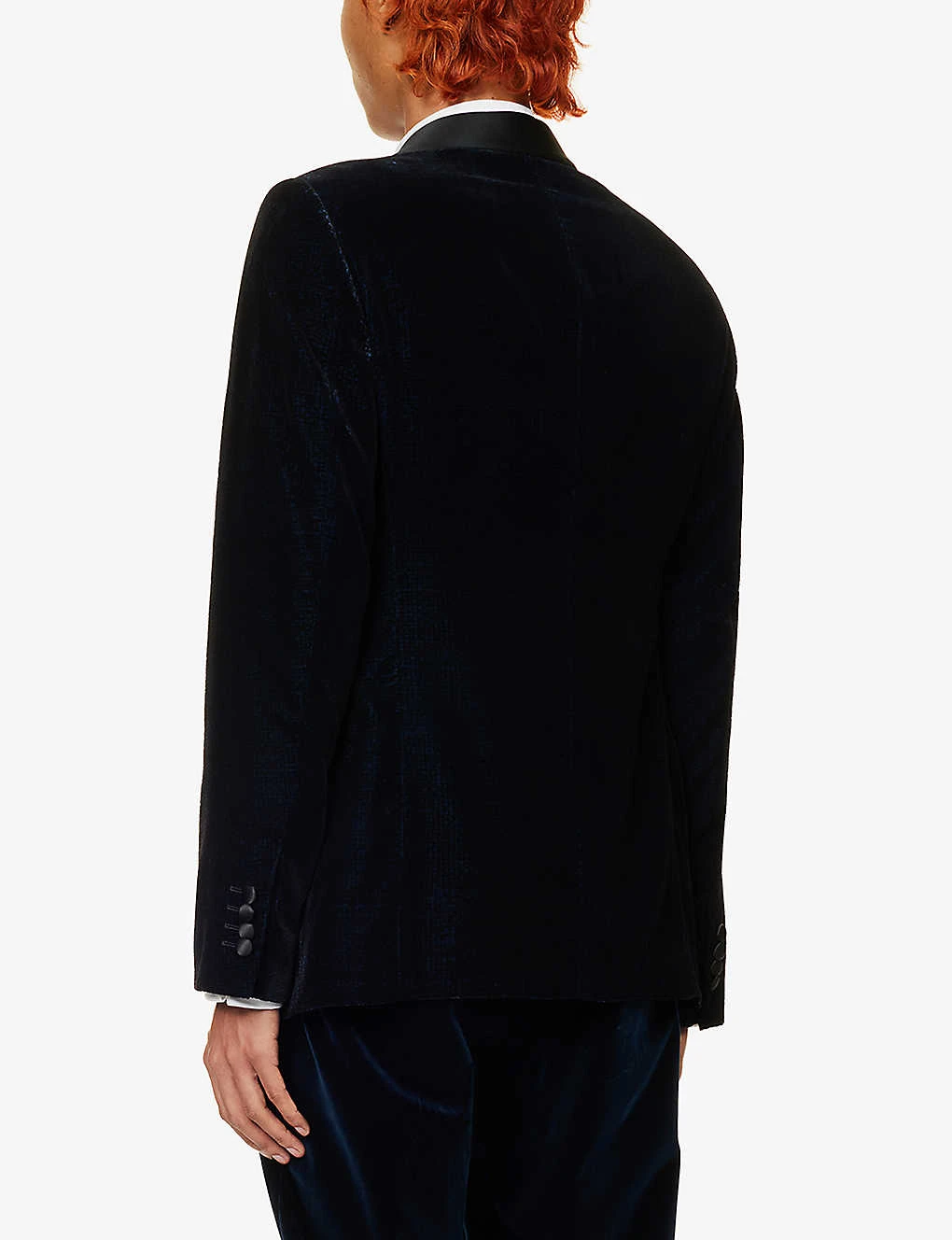 - Regular fit, shawl neck, padded shoulders, long sleeves, buttoned cuffs, welt pocket at chest, darts at front, two jetted pockets at front, velour texture, contrast trims, three slip pockets at interior, lined