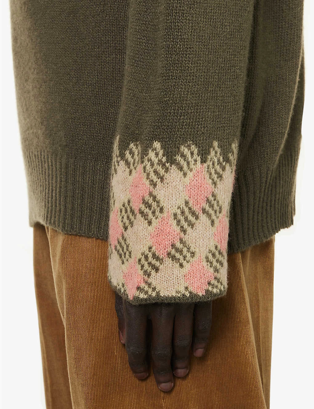 - Regular fit, crewneck, long sleeves, contrast diamond weave at cuffs, embroidered branding at back, medium knit, ribbed trims