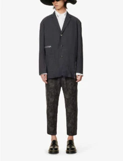 - Boxy fit, notched lapels, padded shoulders, long sleeves, branded patch at sleeve, concealed buttoned cuffs, double breasted, loop at back, fully lined