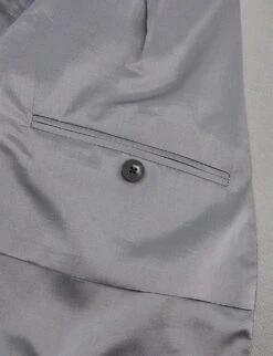 - Relaxed fit, no lapels, padded shoulders, long sleeves, branded patch at sleeve, concealed buttoned cuffs, single breasted, two slip pockets at side, loop at back, fully lined