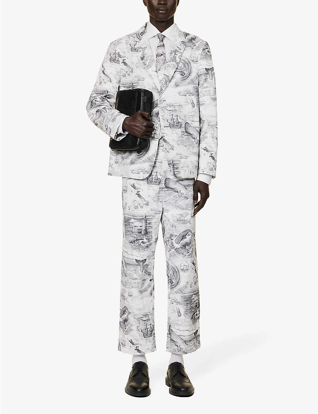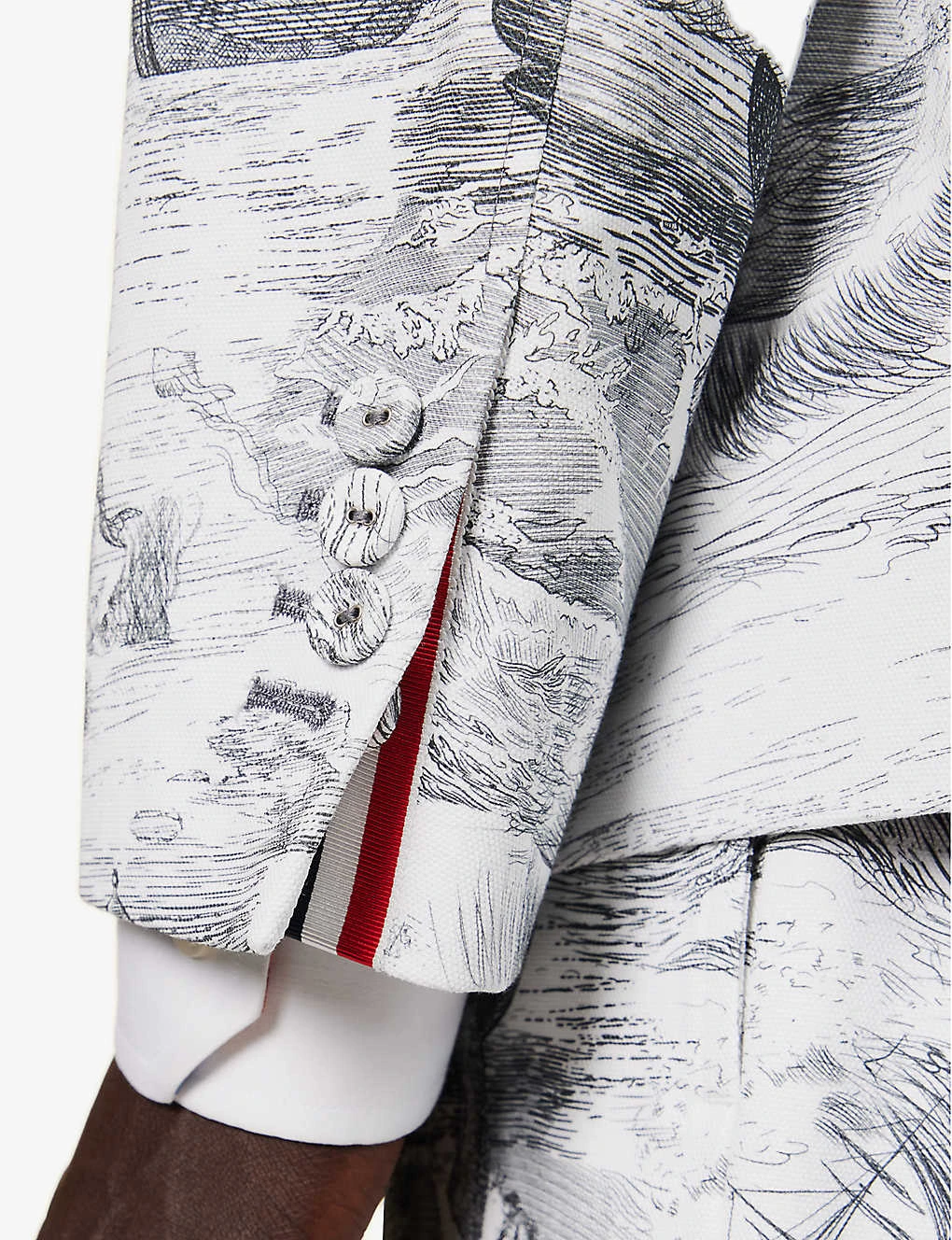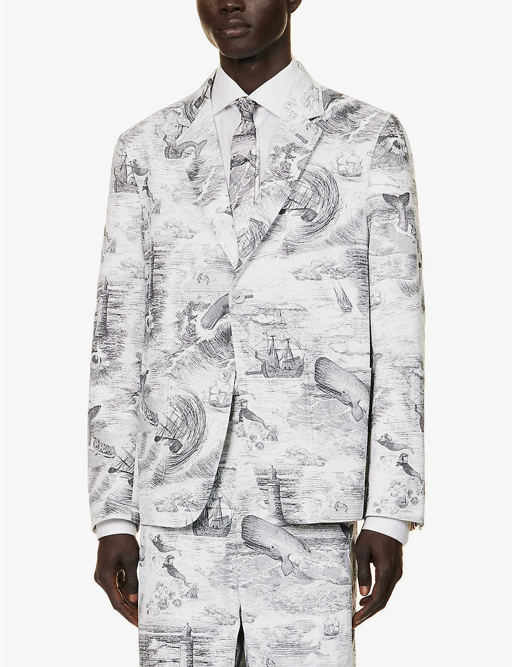- Regular fit, notched lapels, padded shoulders, long sleeves, buttoned cuffs, patch pocket at chest, darts at front, two patch pockets at front, brand patch at back, vent at back, all-over graphic design, three slip pocket at interior, fully lined