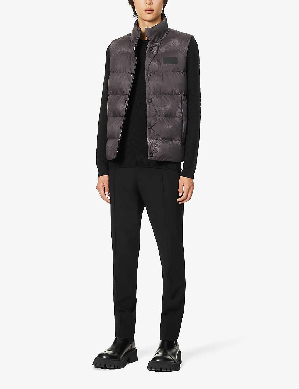 - High neck, sleeveless, all-over snakeskin print, rubberised branded patch at chest, padded, two welt pockets at front, fully lined, two interior pockets