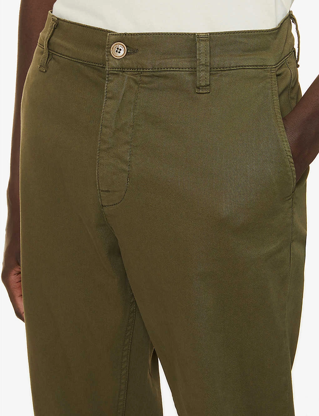 - Exposed button and concealed zip-fly fastenings at front