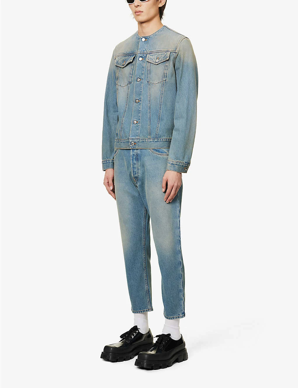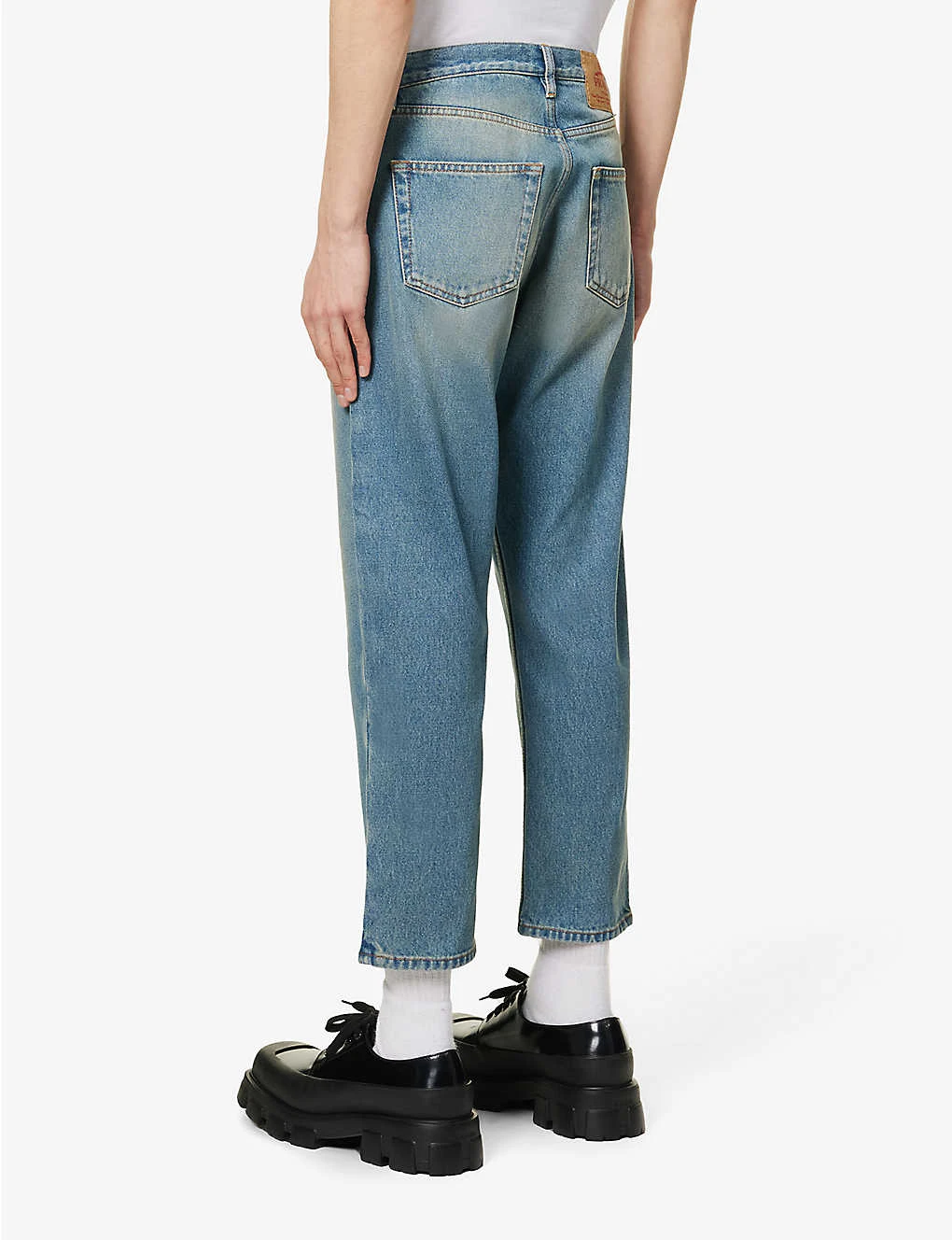 - Regular fit, mid-rise, tapered leg, cropped, belt loops, five pockets, brand plaque at front, brand patch at back, contrast stitching faded wash, partially lined