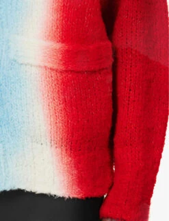 - Regular fit, V-neck, long raglan sleeves, two welt pockets at front, chunky knit, all-over gradient design, branded hardware, popper-fastened split hem at sides, ribbed trims