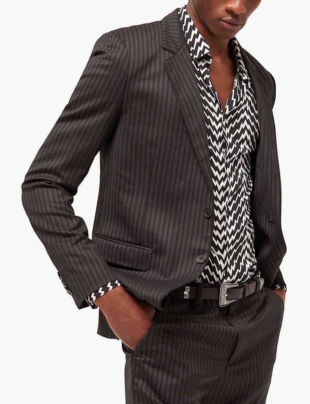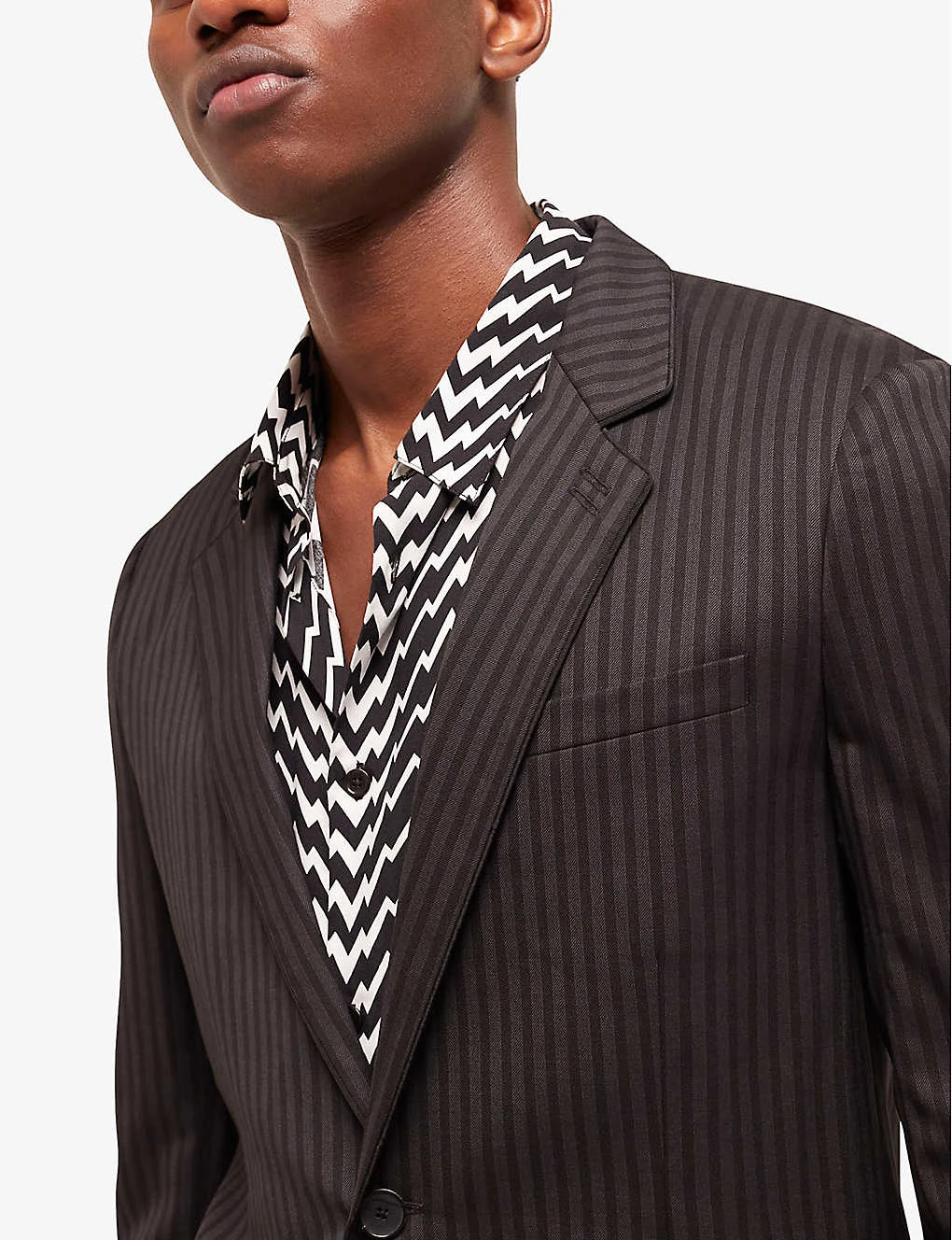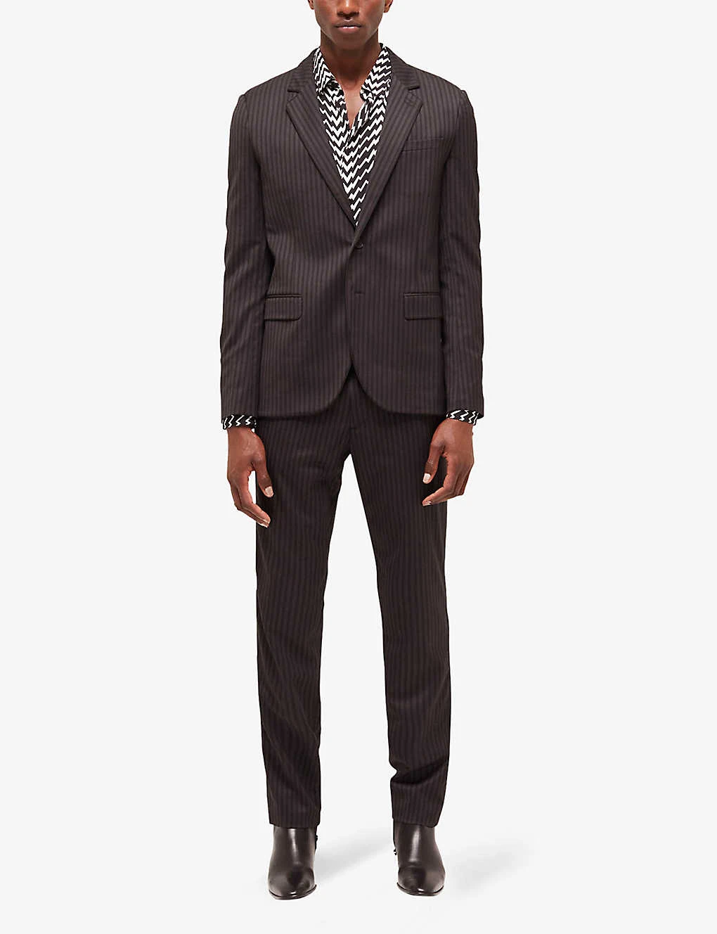 - Slim fit, notched lapel, long sleeves, stripe pattern, single-breasted silhouette