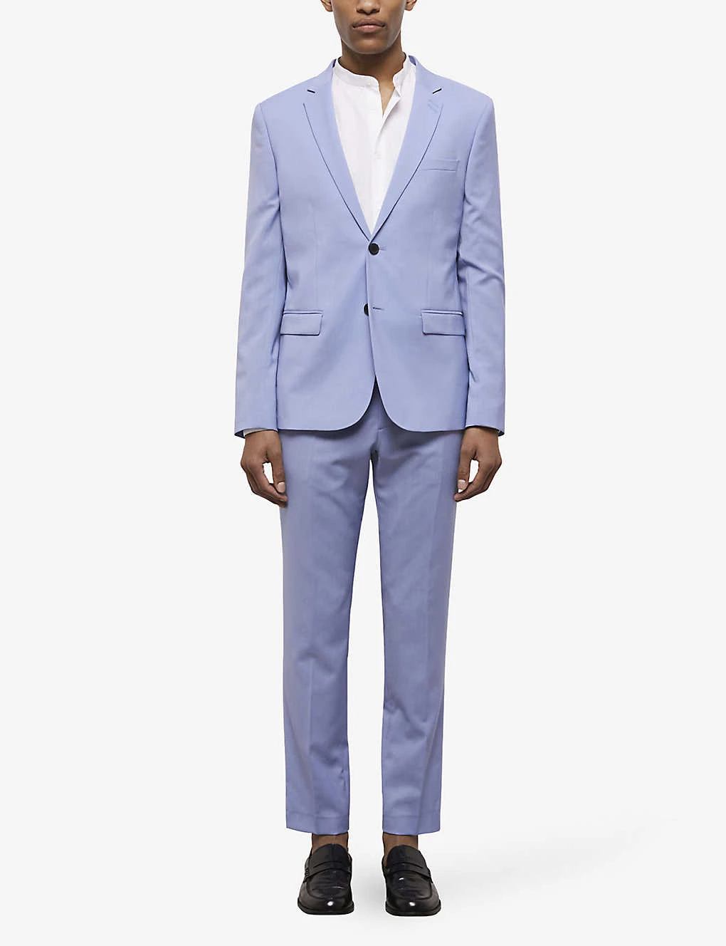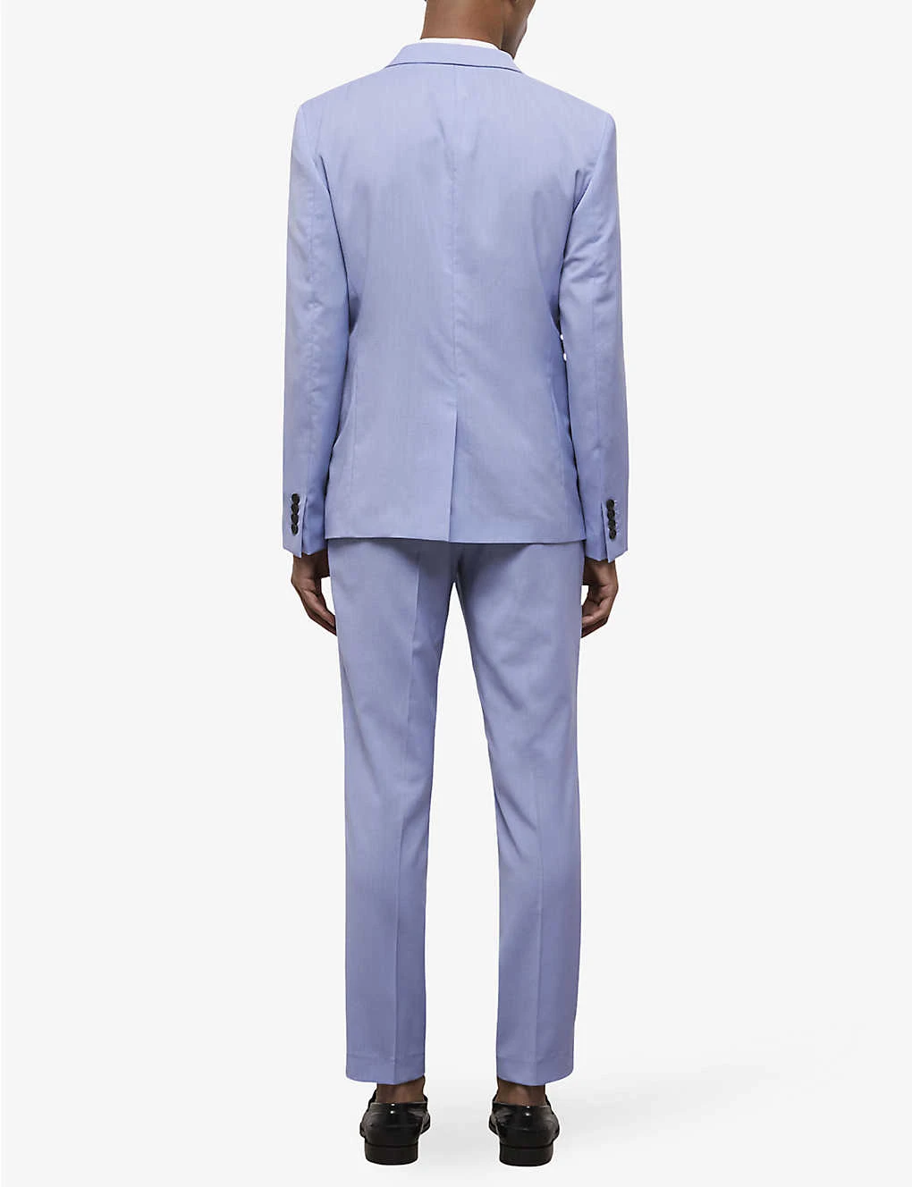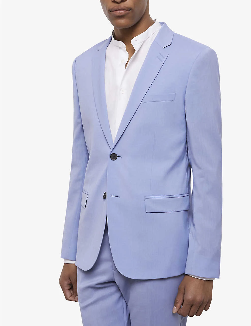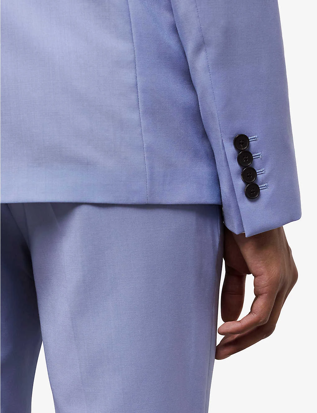 - Notch lapels, buttonholes at lapel, long sleeves, buttoned cuffs, slim-fit, welt pocket at chest, flat pockets at front, single-vent at back hem, curved hem
