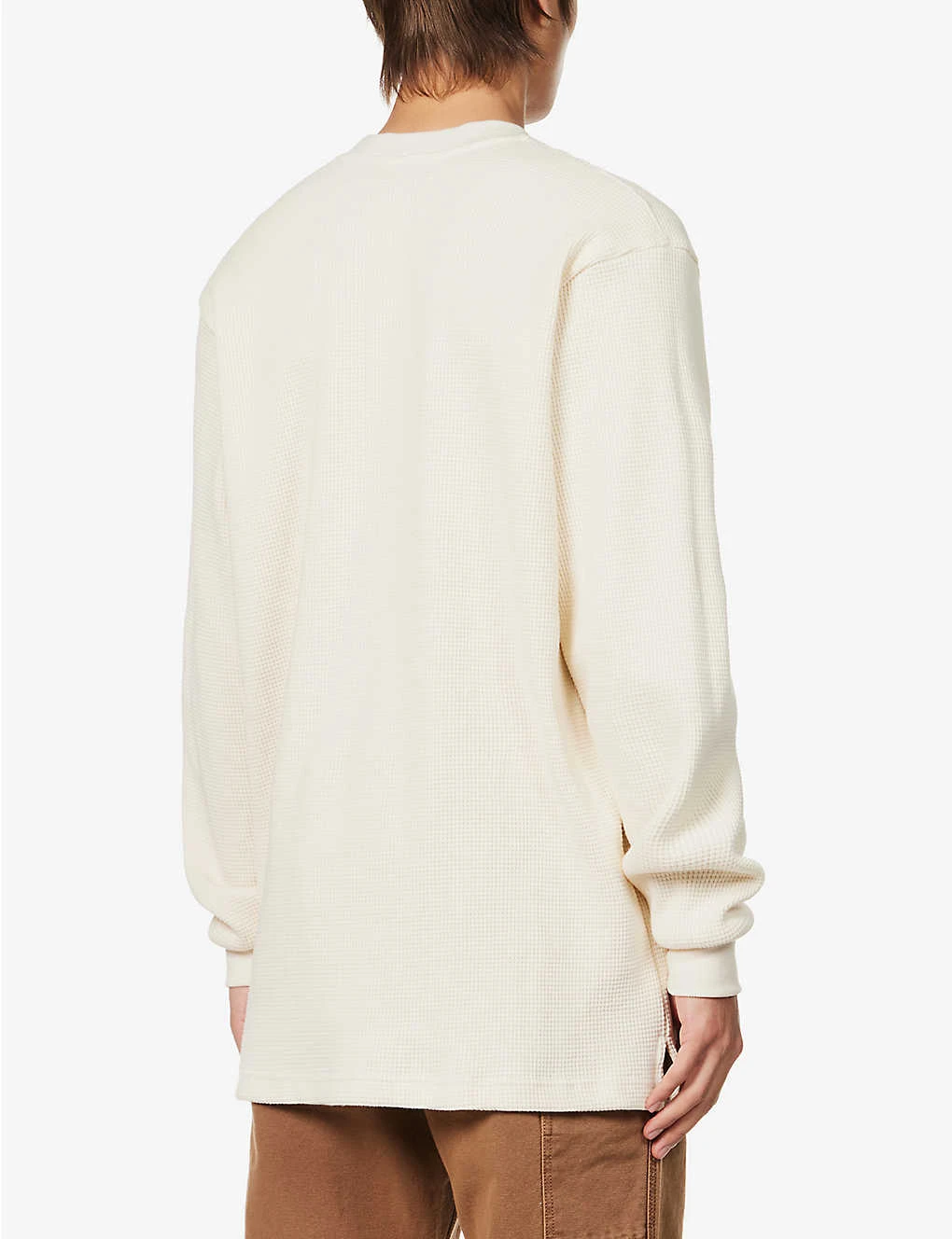 - Relaxed-fit, crewneck, long sleeves, embroidered crochet appliqué with velvet at front, all-over waffle knit, ribbed trims, notched hem