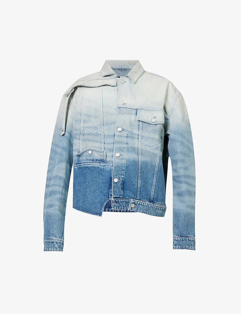 - Boxy fit, spread collar, dropped shoulders, long sleeves, buttoned cuffs, two buttoned flap pockets at front, upside down panel at side, cut-out panel at side, brand patch at back, all-over detachable strap embellishments, silver-toned branded hardware, all-over faded design, partially lined